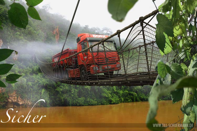 | Spedition Bork: Sicher. Fotomontage für einen Kalender der Firma Bork. Der LKW ist ein 3D-Computermodell, das in ein retuschiertes Dschungelfoto montiert wurde. Das Hintergrundbild (jenseitiges Ufer) wurde von Christian Wagner am Kwai geschossen. Anmerkung: Im Originalkalender gibt es aus Lizenzgründen ein anderes Urwaldbild. |