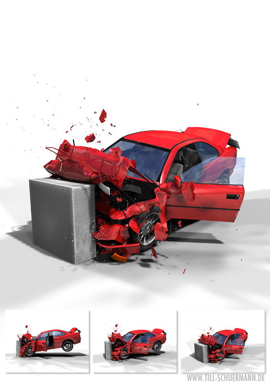 | Frontalaufprall. 3D-Grafik für die Projektgruppe PKW-Fußraum-Intrusion am MMEW. Während in den letzten Jahren der Schutz für den Kopf des Fahrers wesentlich verbessert wurde (z.B. durch Front- und Seitenairbags), ist die Gefährdung durch in den Bein- und Fußraum eindringende Fahrzeugteile nicht wesentlich reduziert worden. Die Projektgruppe soll das ändern. Der BMW beruht auf einem De-Espona-Modell. |