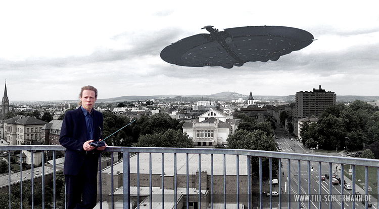 | VLSS über dem Berliner Platz. Das VLSS (Very Large Space Ship) wurde für eine Folge der TV-Serie "Redaktion D" des Goethe-Instituts gebaut. Es fliegt hier über den Berliner Platz in Gießen. Gut zu erkennen: Stadttheater und Kirchenturm. Links die Johanneskirche, vorne die Kongresshalle. Das Geländer existiert an dieser Stelle nicht. Und die Fernsteuerung ist ein kleiner Scherz am Rande. |