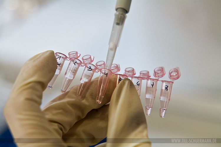 | Genlabor I. Hier wird DNA für eine molekularpathologische Untersuchung vorbereitet. Mittels PCR (Polymerase-Kettenreaktion) werden einzelne Abschnitte der Erbsubstanz eines Patienten exponentiell vervielfältigt, um nach Krebsgenen zu suchen oder um Genbestandteile spezieller Viren zu finden. |