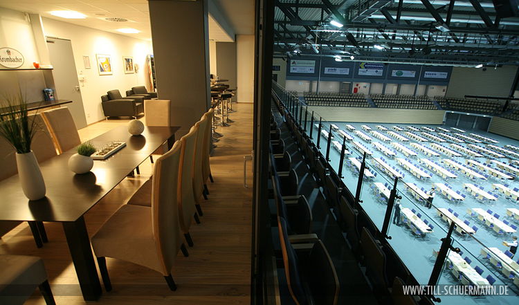 Links eine VIP-Loge, rechts die (bestuhlte) Halle.