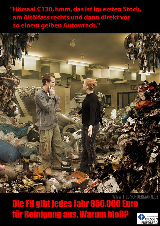 | Müll I. Die Fachhochschule wollte eine Müllkampagne starten. Und da wir ein wenig Angst hatten, uns mit den üblichen Mach-Mit-Aktionen und Wer-am-meisten-Müll-sammelt-kriegt-eine-öffentliche-Ehrung-und-einen-Müllsammelpreis-vom-Direktor-und-kommt-in-die-Zeitung zu blamieren, wollten wir es mit Humor versuchen. Das Bild ist übrigens eine Montage. |