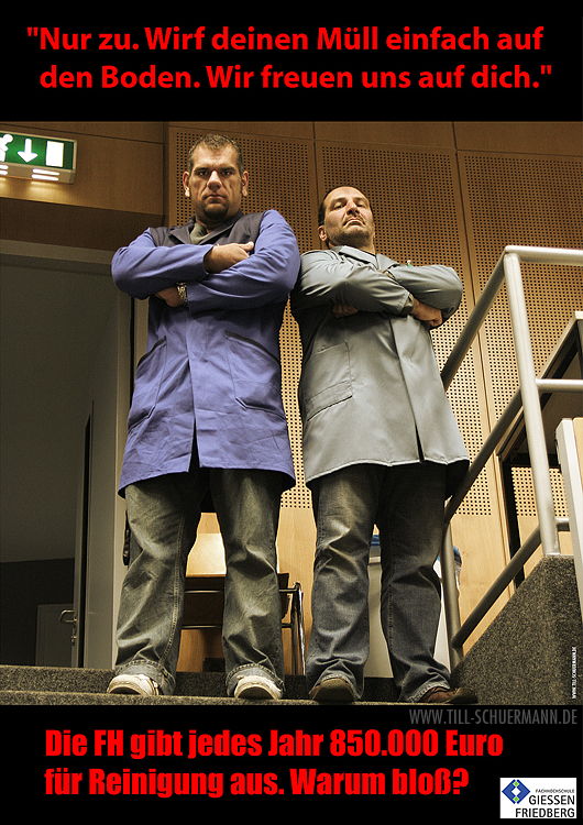 Für den zweiten Teil der Müllplakatserie habe ich Anleihen bei einem Raubkopierer-Plakat genommen. Die beiden Herren fanden übrigens einigen Spaß dabei, als Hausmeister verkleidet unschuldige Studenten rundzumachen ("DU! HEB DAS AUF!").