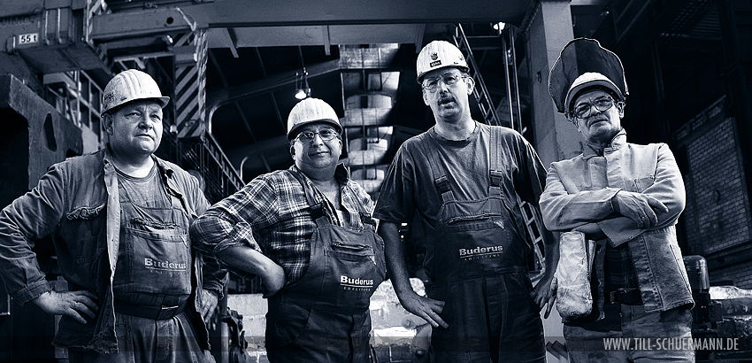 | Die Stahlwerker von Schicht 5, Buderus, Wetzlar. Von links: Reiner Lange, Transportmann, lädt rohe Stahlblöcke von bis zu 150 Tonnen in den Ofen. Hardi Peter, Kranfahrer, bugsiert die über tausend Grad heißen, glühenden Blöcke weiter zur Presse. Ralf Kuhn, Pressefahrer, bedient die 55-Meganewton-Presse und bringt den Stahl dort nach und nach in die gewünschte Form. Manuel Mejias-Gomez, Schmied, organisiert den Schmiedeablauf und überprüft die Maßgenauigkeit. Der ganze Prozess ist ziemlich heiß, ziemlich laut und ganz schön beindruckend. |